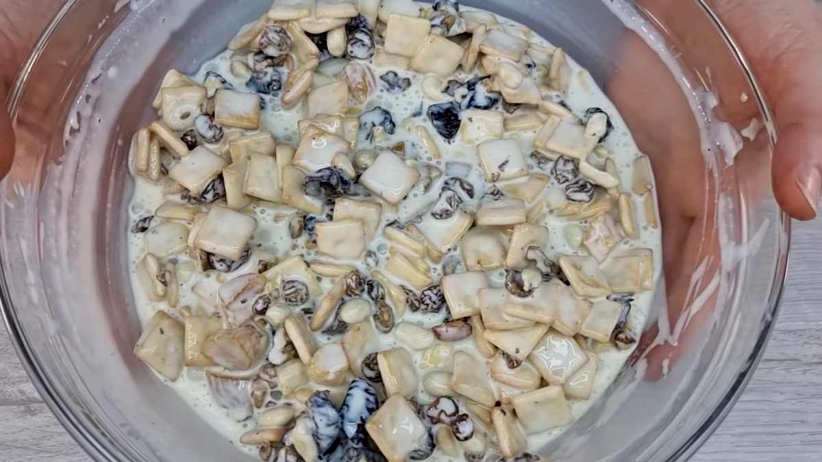 Owoce, krakersy i orzechy wlej do przygotowanej mieszanki ze śmietany i mleka. Formę wyłóż folią spożywczą i przelej gotową masę.