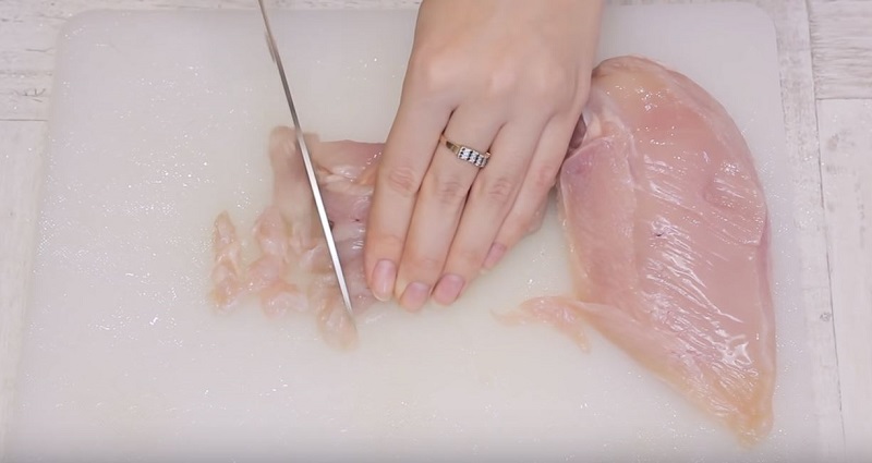 1. Filety z kurczaka umyj, osusz ręcznikiem papierowym i posiekaj nożem. Dzięki temu, że mięso nie będzie mielone, kotleciki będą bardzo soczyste i miękkie.
