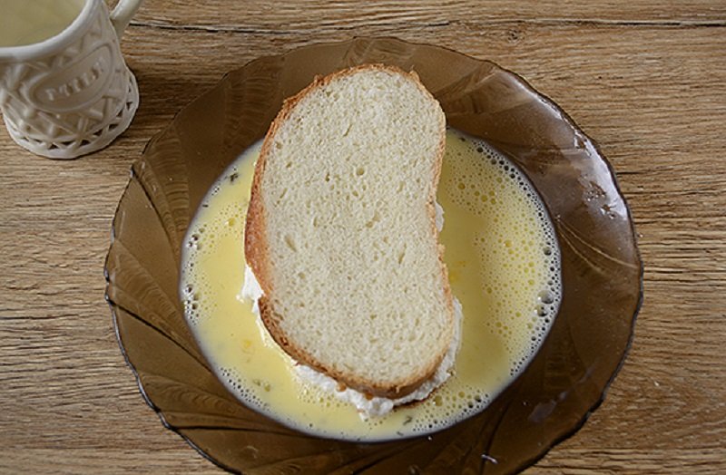 3. Na 6 kromkach chleba rozłóż twarożek, i przykryj je pozostałymi kromkami. Przygotowany tak chleb, zanurzaj w mleko z każdej strony, a potem w roztrzepanym jajku.