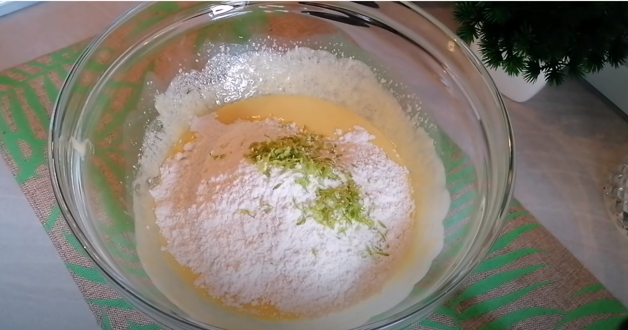 2. Teraz, dodaj mąkę, startą skórkę z cytryny, sól i proszek do pieczenia. Mieszaj, do uzyskania jednolitej, gładkiej konsystencji.