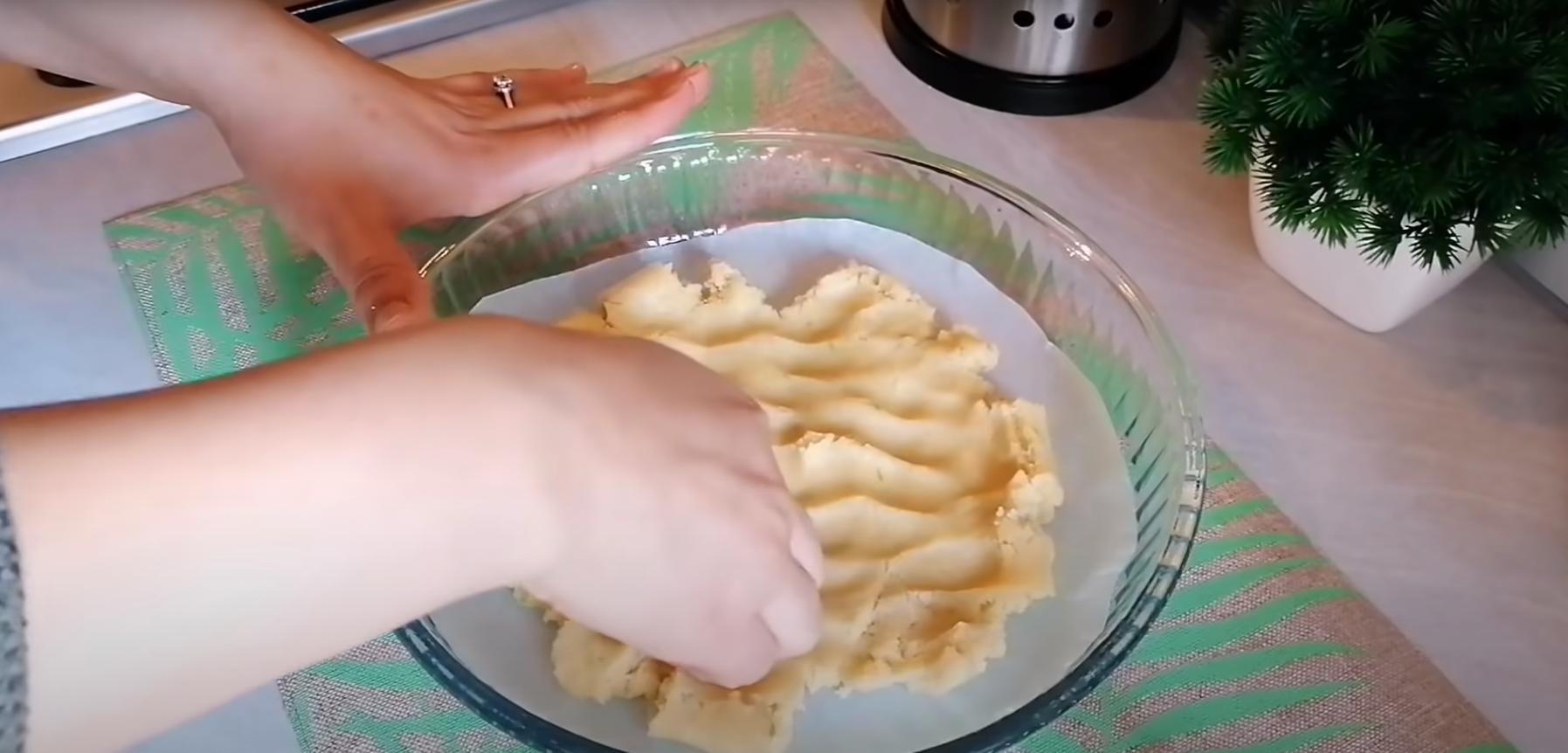 5. Jedną część ciasta wyłóż równomiernie na dnie formy.