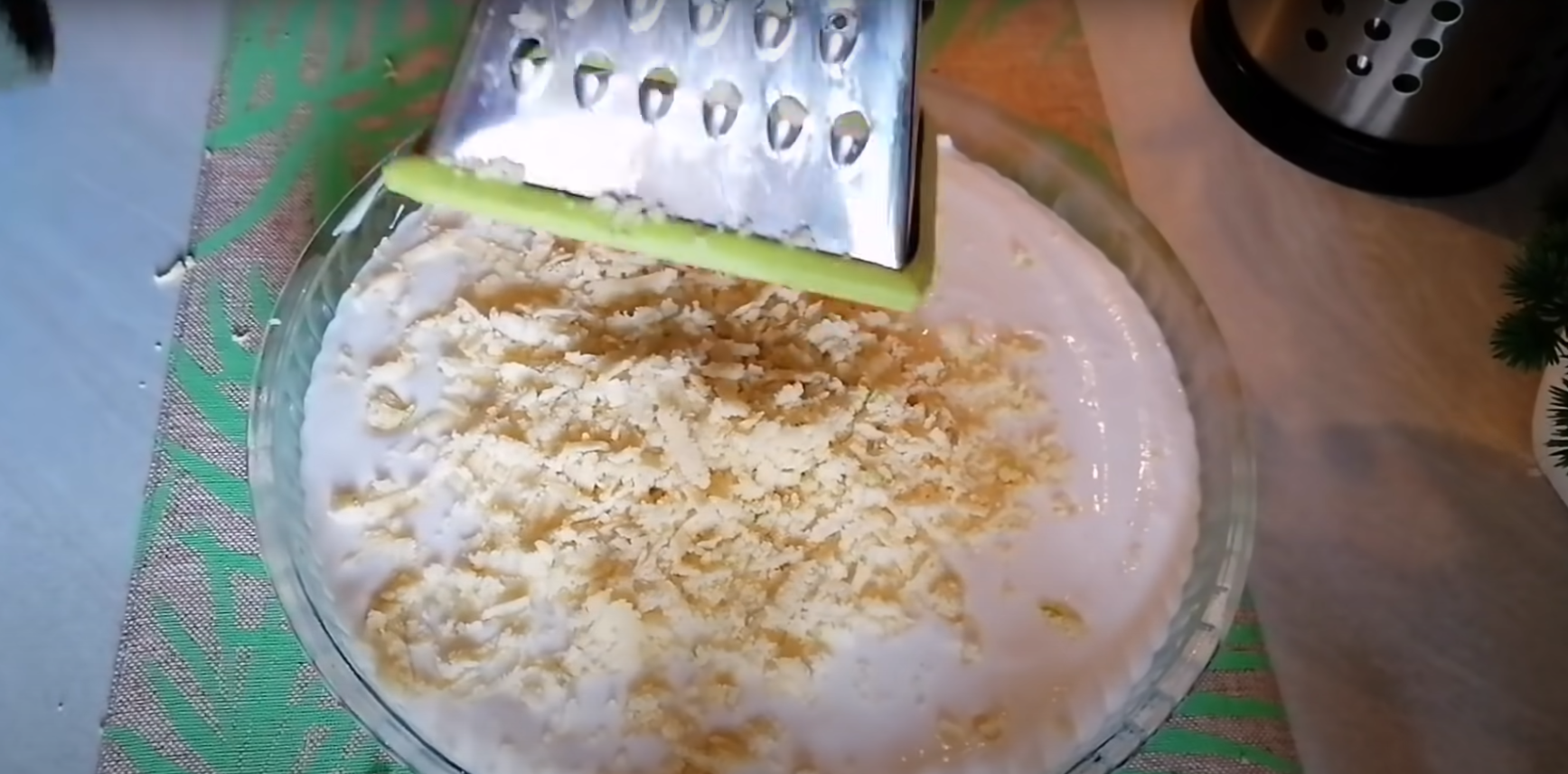 7. Gotowy krem, wyłóż równomiernie na warstwie ciasta. Na wierzch, zetrzyj równomiernie drugą część zmrożonego wcześniej ciasta.