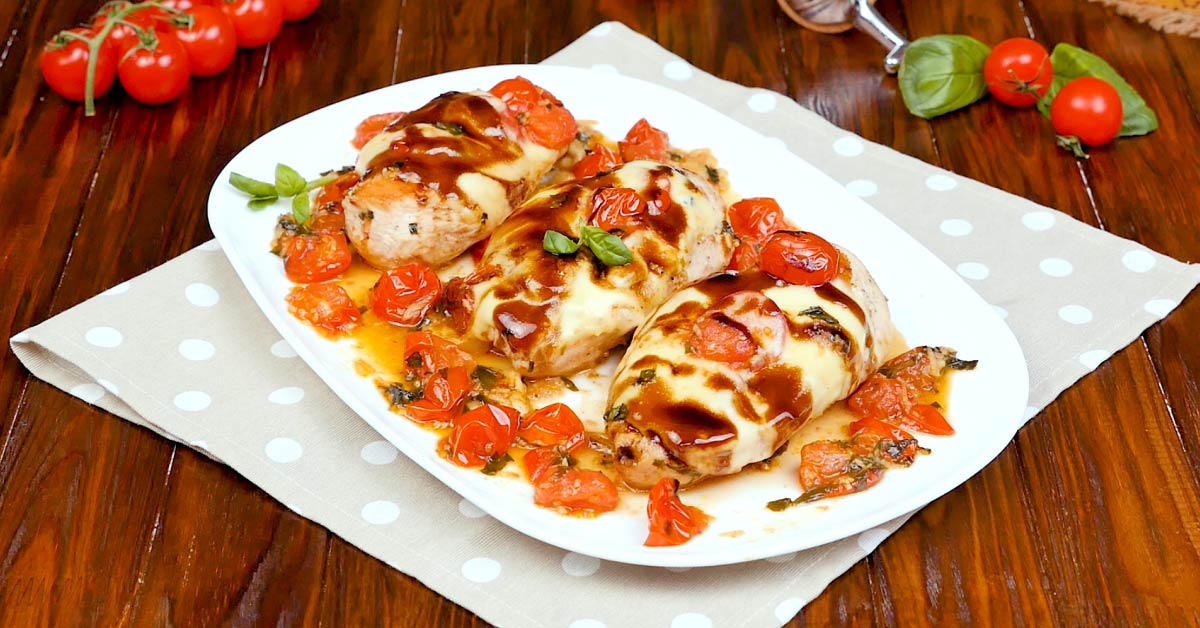 To aromatyczny kurczak z mozzarellą, bazylią, pomidorkami i oliwą z oliwek, który w jednej chwili przeniesie Cię do gorących Włoch.