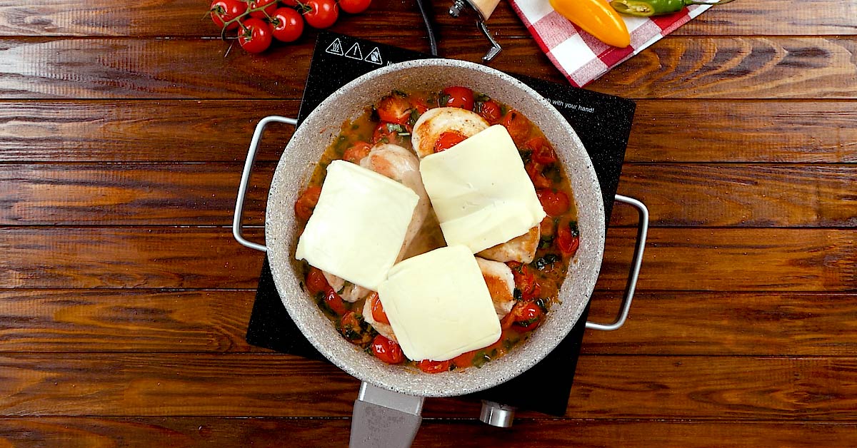 3. Na koniec, dodaj pokrojoną bazylię, wymieszaj i ułóż ponownie na patelnie filety z kurczaka. Na ich wierzchu, poukładaj podsmażone pomidorki koktajlowe i plasterek mozzarelli.