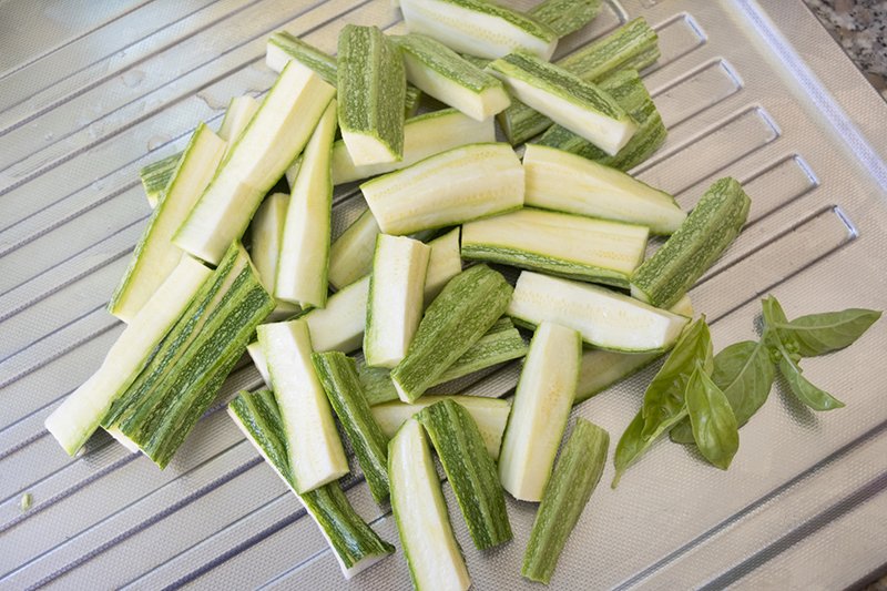 2. Cukinie umyj, osusz ręcznikiem papierowym i pokrój wzdłuż na ćwiartki o długości 8 cm.