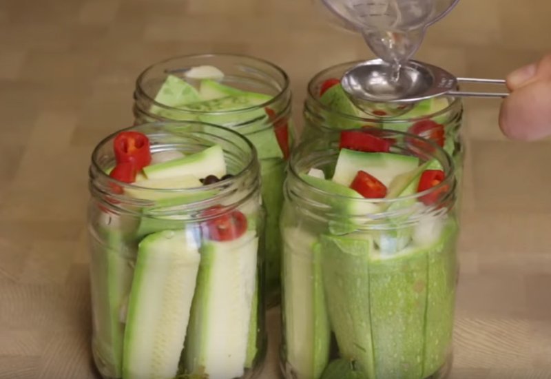 1. Z odstawionych wcześniej słoików z cukinią, odlej całą wodę i wlej do każdego łyżkę stołową octu. Na koniec, zalej cukinię przygotowaną wcześniej marynatą.