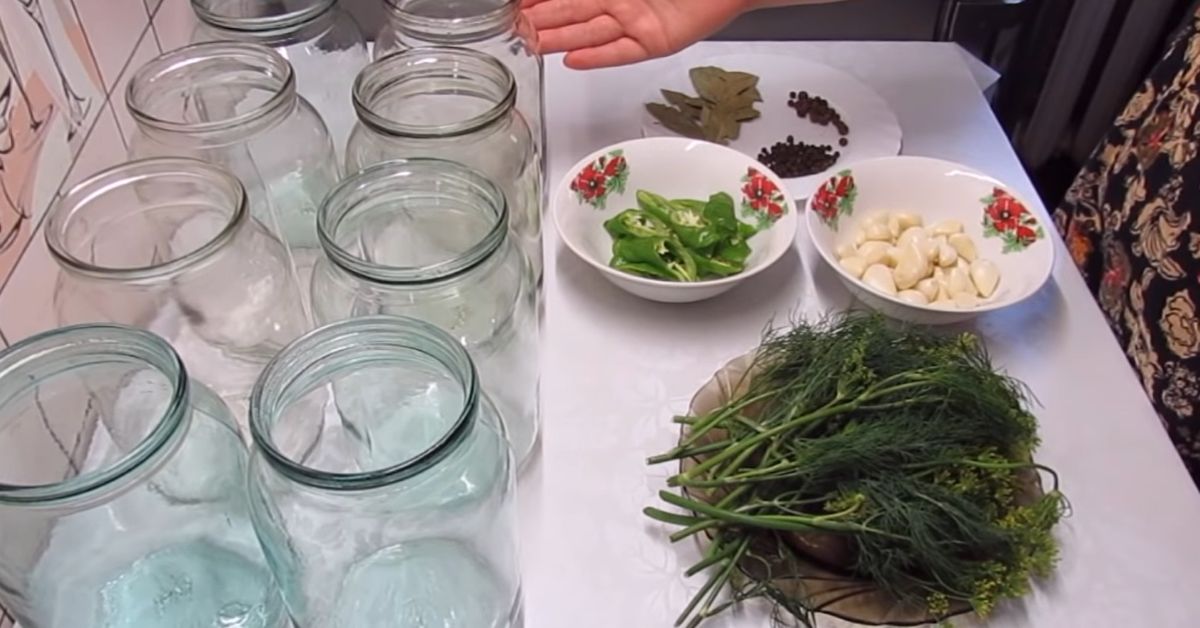 1. Zacznij od przygotowania słoików. Umyj, wysterylizuj i osusz 8 słoików o pojemności 1 litra. Na dnie każdego słoika umieść parasol koprowy.