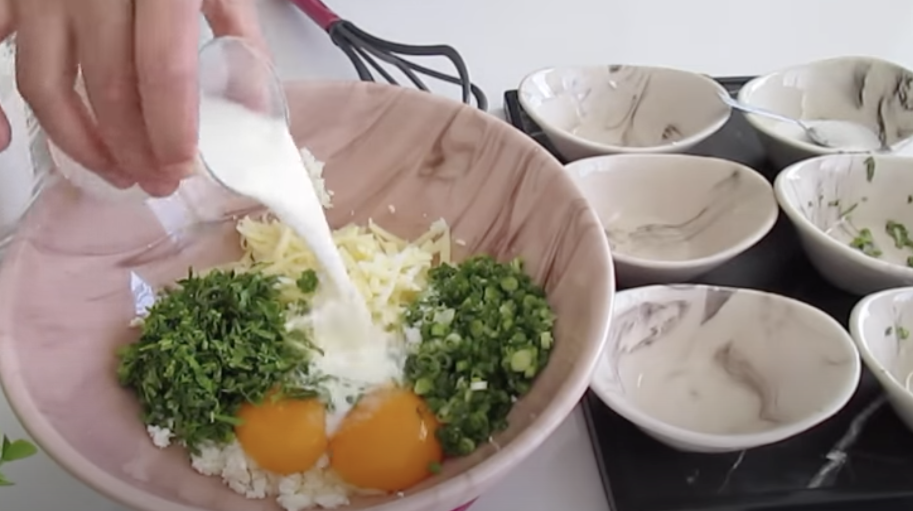 2. Przełóż ser do miski, dodaj starty na tarce ser żółty, jajka, mleko, mąkę z proszkiem do pieczenia i posiekaną pietruszkę oraz szczypiorek.