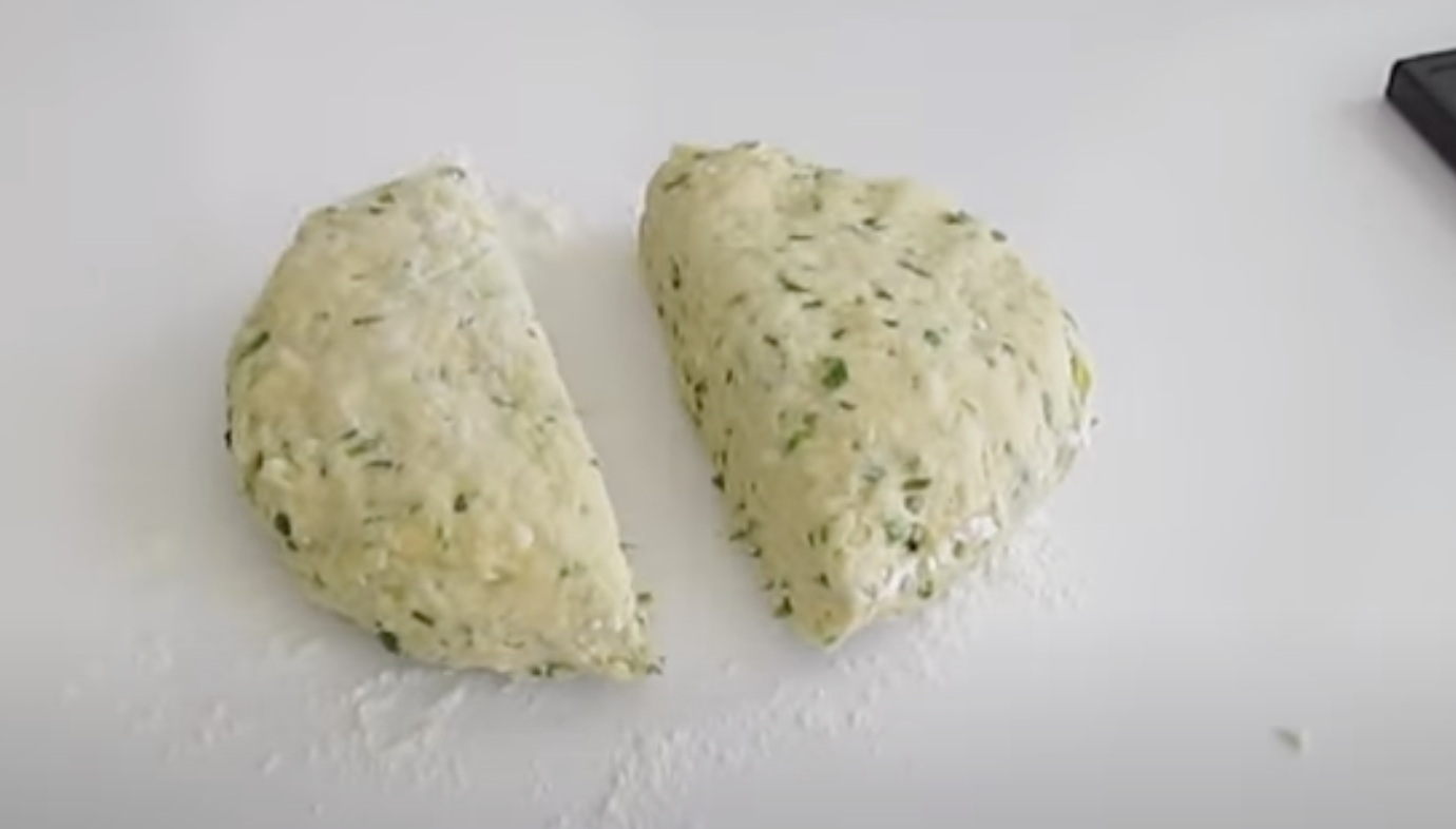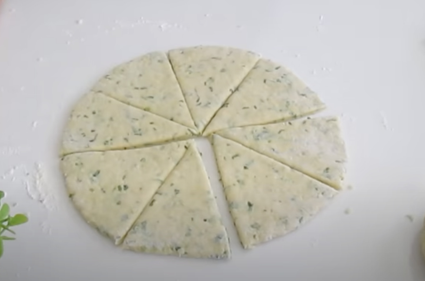 4. Na posypanym mąką blacie roboczym, rozwałkuj ciasto w kształt koła. Następnie, koła podziel na osiem trójkątów.
