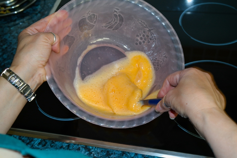 1. Jajka (5 sztuk) dobrze umyj pod ciepłą bieżącą wodą i sparz wrzątkiem. Potem, roztrzep je widelcem ze szczyptą cukru.