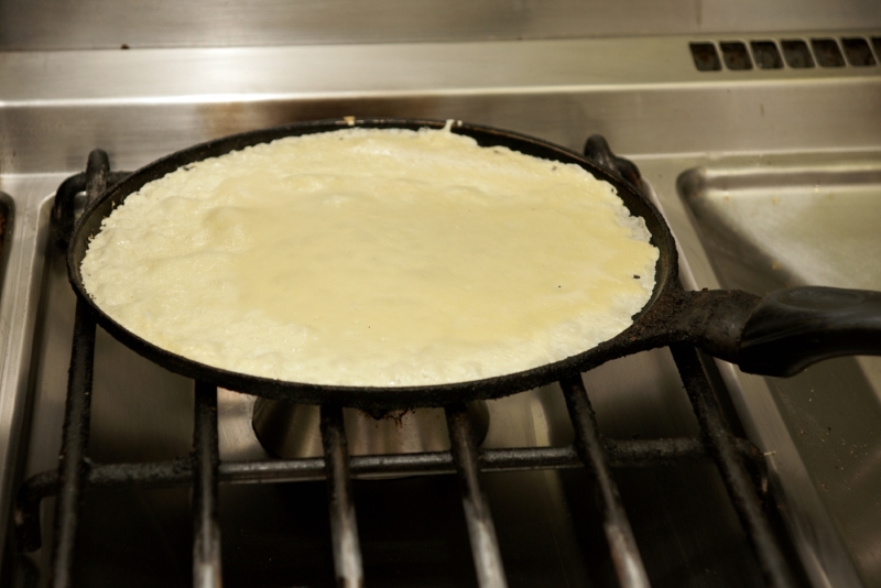 4. Na rozgrzaną patelnię z olejem, nakładaj porcję ciasta i okrężnym ruchem rozprowadź je na całą powierzchnię patelni. Smaż cienkie naleśniki z każdej strony na złoty kolor.