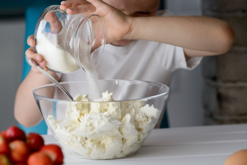 5. Gdy usmażysz już wszystkie naleśniki, czas na banalnie proste nadzienie: Twaróg rozgnieć widelcem w misce, dodaj jajko i cukier do smaku. Nadzienie gotowe!