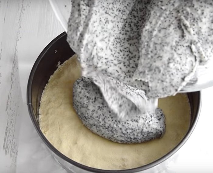 Formę do pieczenia wyłóż specjalnym papierem do pieczenia. Najlepiej aby miała średnicę około dwudziestu cm. Na dnie ułóż bazę na ciasto. Zwróć uwagę by rozłożyć ją równomiernie i delikatnie ubić dłońmi. Następnie wylej masę twarogowo – makową.