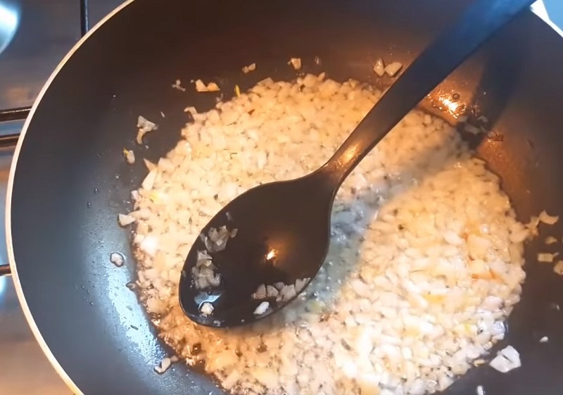 3. Na rozgrzanej patelni z olejem, podsmaż cebulkę pokrojoną w kosteczkę. Gdy nabierze złotego koloru, dodaj drobno poszatkowaną kapustę i wymieszaj.