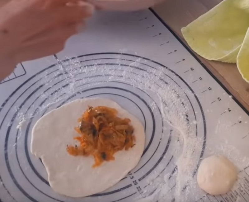 5. Przygotowane wcześniej ciasto, podziel na mniejsze kawałki. Każdą rozpłaszcz w dłoni, nałóż porcję nadzienia i zawiń szczelnie w cieście.