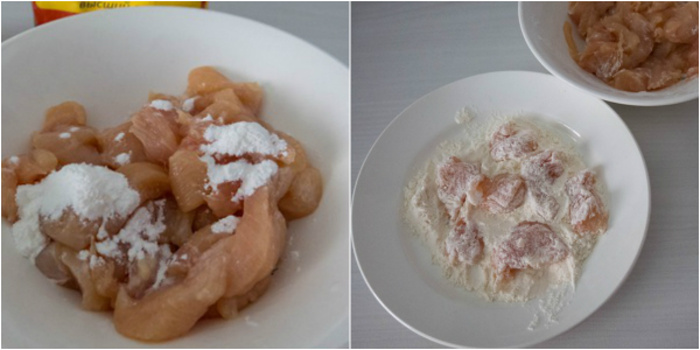 Zaczynamy od umycia i osuszenia piersi z kurczaka, które następnie kroimy na duże kawałki (mogą też być szerokie paski). Mięso mieszamy z sodą, dodajemy cytrynę oraz skrobię i ponownie mieszamy. Mięso wkładamy do lodówki na co najmniej 20 minut. Po tym czasie musimy już tylko obtoczyć każdy kawałek w mące i usmażyć 🙂