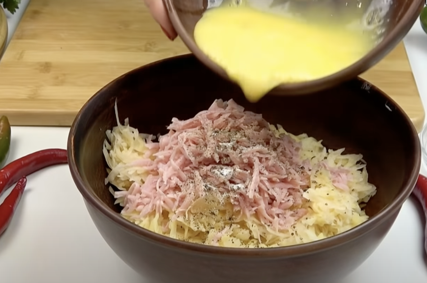 3. Odsączone ziemniaki przełóż do miski, dodaj jajka, szynkę pokrojoną w cienkie paski, starty na tarce o grubych oczkach ser i posiekaną natkę pietruszki.