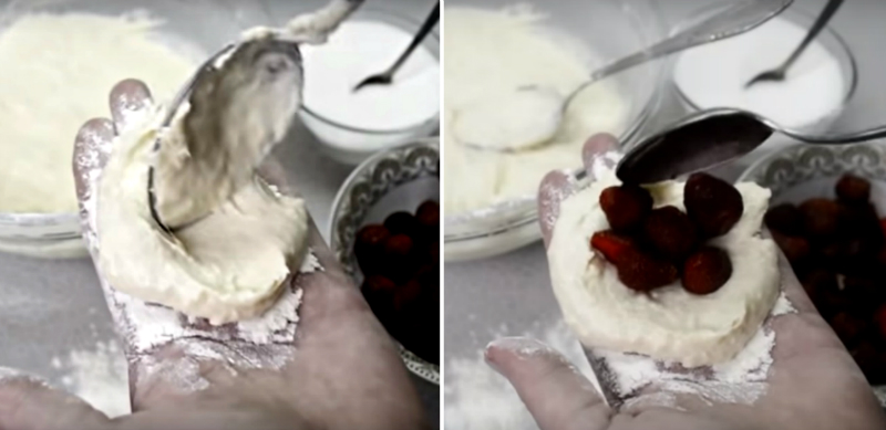 2. Dłoń lekko posyp mąką, wyłóż na nią łyżkę ciasta i na jego środku ułóż kilka jagód. Teraz zawiń brzegi ciasta do środka i złącz dokładnie ze sobą. Przygotowanego placuszka, kładź bezpośrednio na rozgrzaną patelnię z olejem.