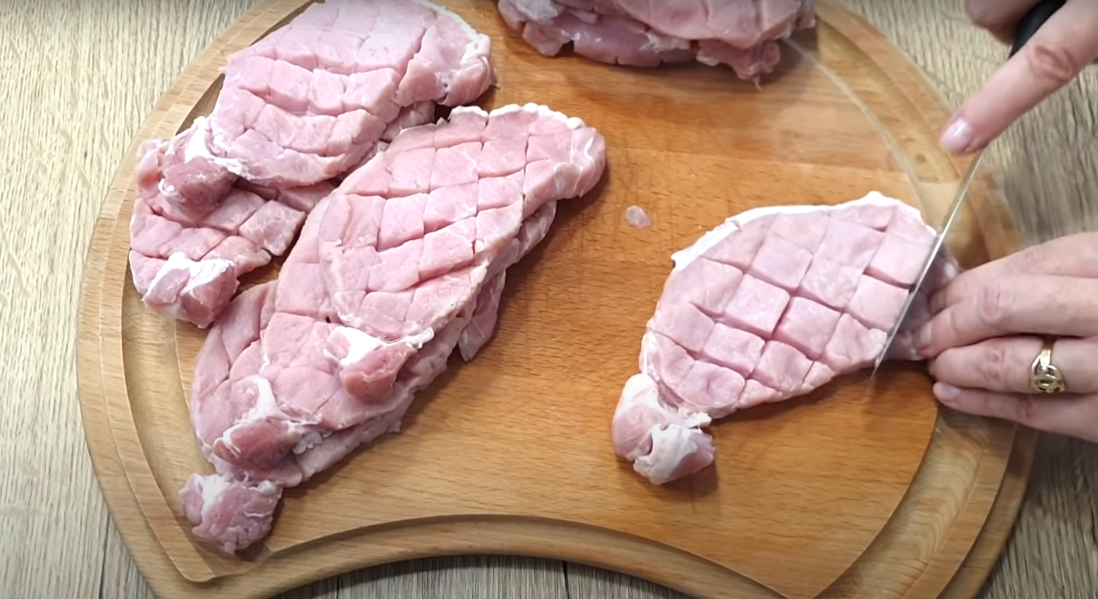 2.Czas na przygotowanie mięsa. Schab pokrój w plastry. Maksymalna grubość powinna być 1,5 cm. We wzór siateczki ponacinaj z obydwu stron. Z każdej strony przypraw solą.