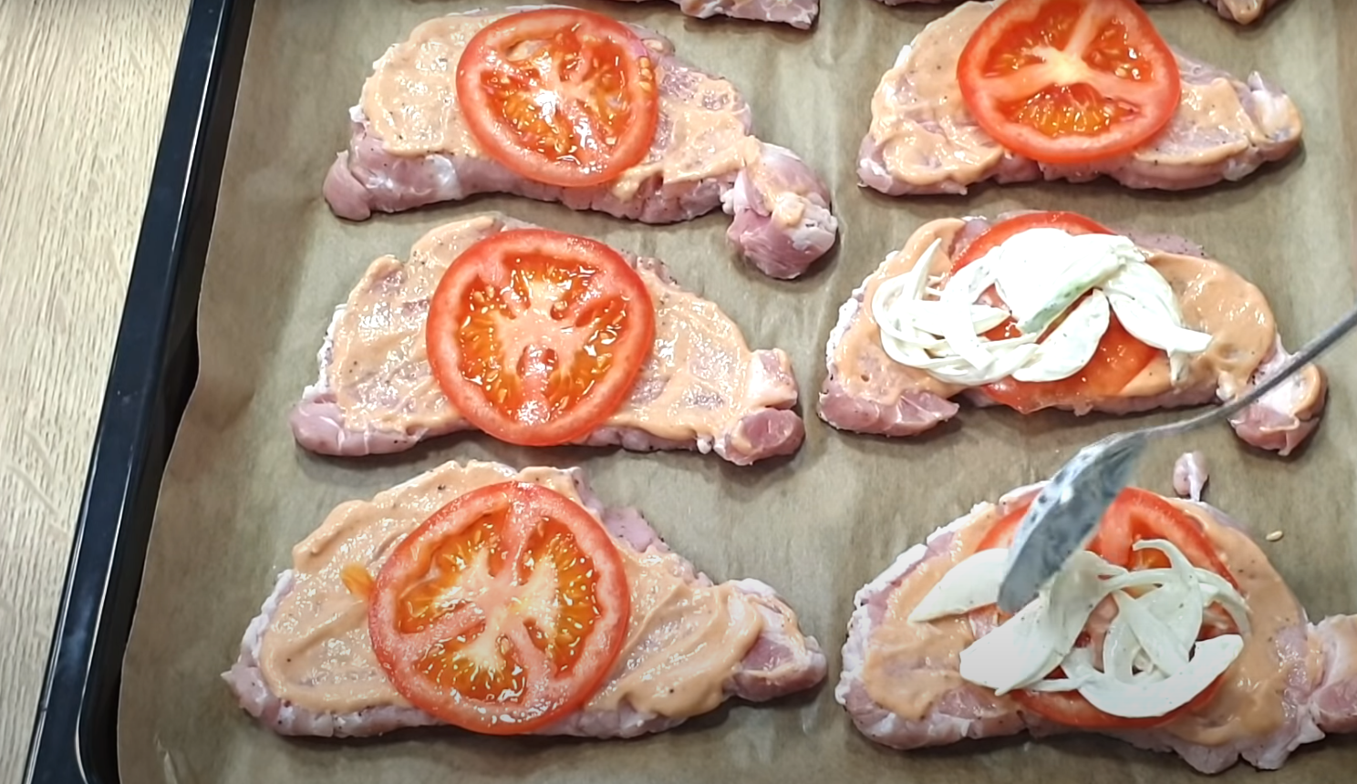 3. Papierem wyłóż blachę i kładź na niej przygotowane mięso. Posmaruj sosem każdy kawałek, połóż plaster cebuli i pomidora.