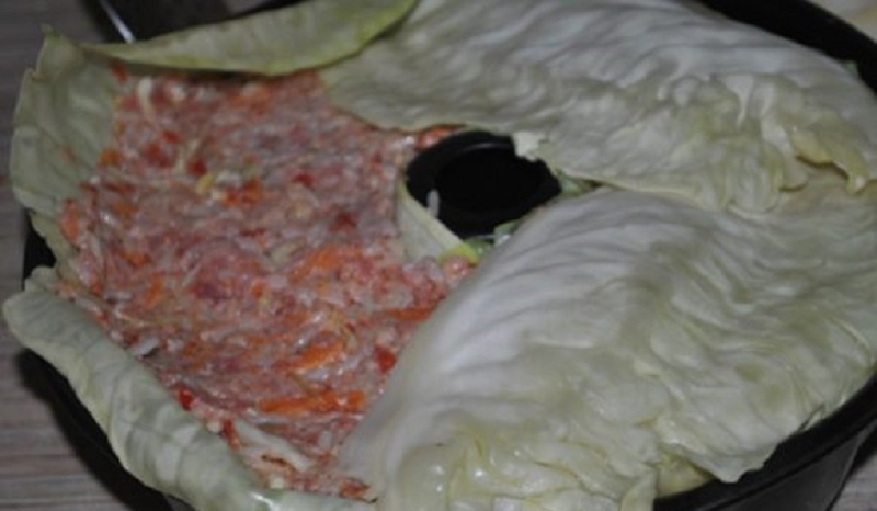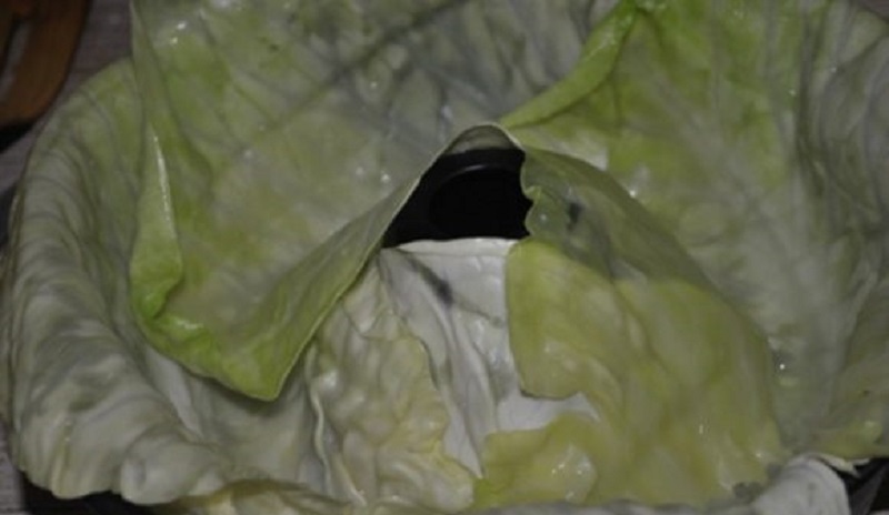 1.Kilka liści kapusty połóż na dnie naczynia , następnie zostaw kilka liści na przykrycie góry , pamiętaj aby twarde części odkroić.