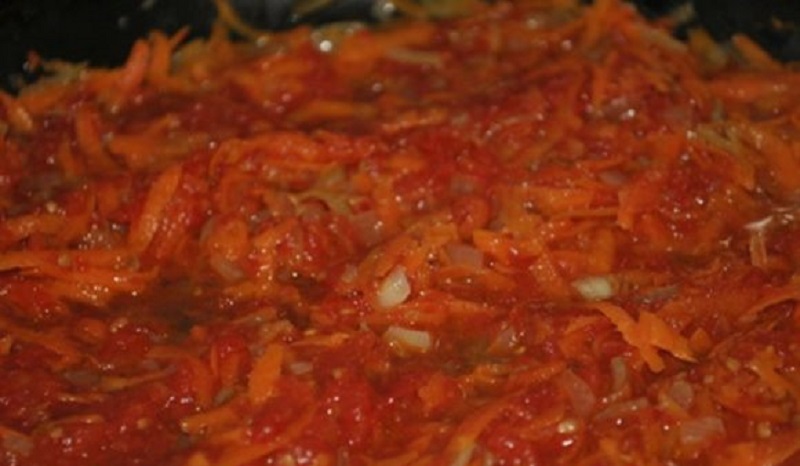 2. Marchew i cebulę dokładnie posiekaj. Dolej do nich sok pomidorowy, następnie duś przez 5 minut.
