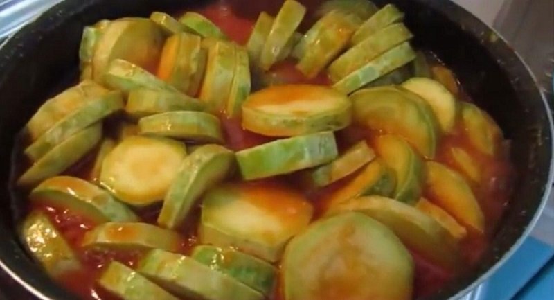 3. Potem, dodaj sok pomidorowy, zmielone warzywa i pokrojoną w plastry cukinię. Gotuj wszystko razem na małym ogniu przez 20 minut.