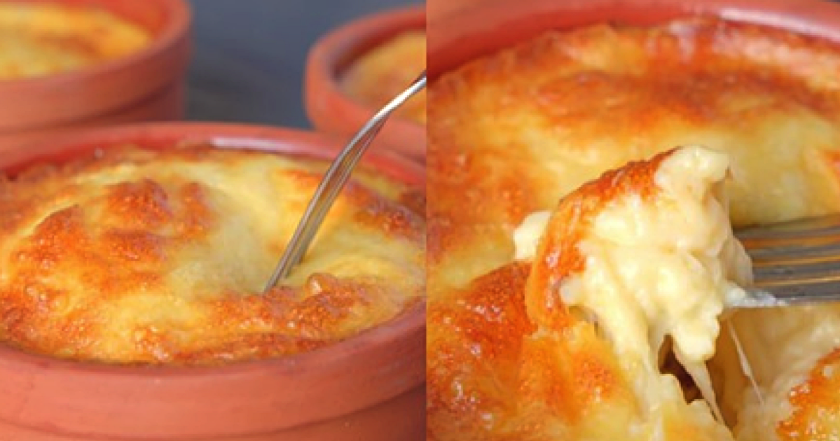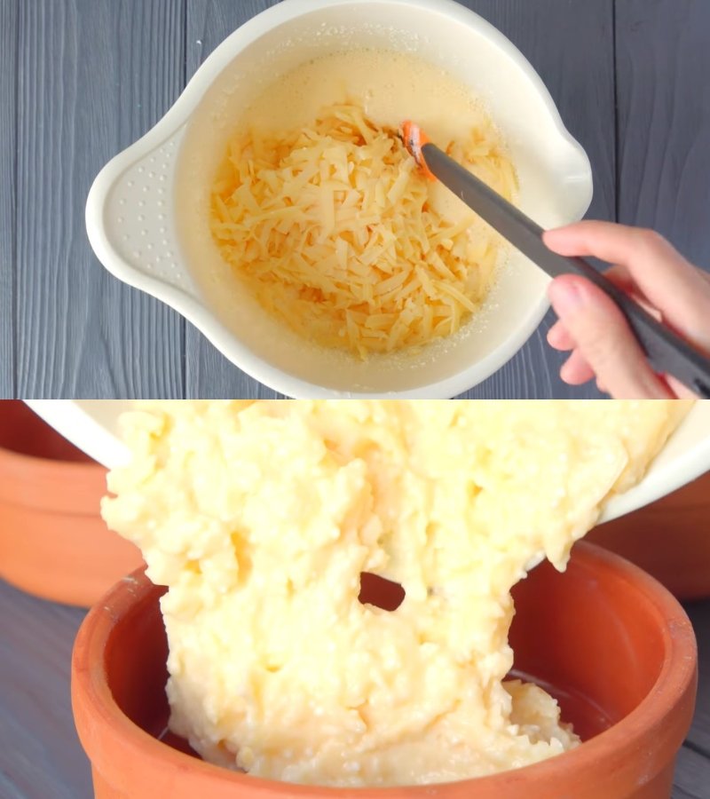 2. Następnie, dodaj skrobię, sodę, starty na tarce o grubych oczkach ser i ponownie wymieszaj. Gotową masę serową, przełóż do wysmarowanych olejem, małych naczyń ceramicznych lub jednej dużej (czas pieczenia będzie dłuższy).