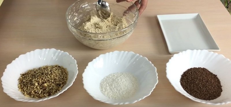 W osobnej miseczce dokładnie rozgnieć przygotowane orzeszki ziemne oraz herbatniki, a następnie wymieszaj je ze zblendowanym twarogiem. Z powstałej masy uformuj kulki lub inny wybrany kształt. Tak przygotowane ciasteczka obtocz w przygotowanych wcześniej posypkach.