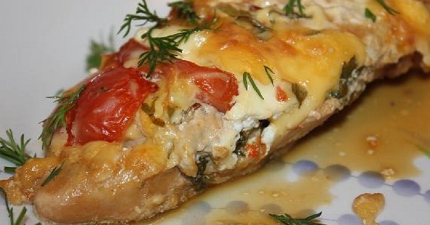 3.W trzech miejscach natnij każdy kawałek .W nacięciach naprzemiennie wkładaj ser i pomidora. Polej to przygotowaną śmietaną z czosnkiem.
