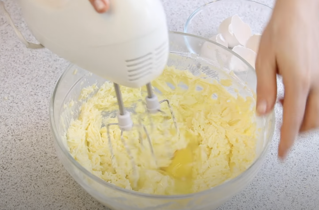 Miękkie masło utrzyj przy pomocy miksera na puszystą masę. Do utartego masła stopniowo dodawaj po jednym jajku (2 sztuki – trzecie zostaw na posmarowanie wierzchu ciasta), miksując na średnich obrotach. Wymieszaj mąkę, sól i proszek do pieczenia – dodawaj po 1 łyżce do masy, wciąż ucierając.