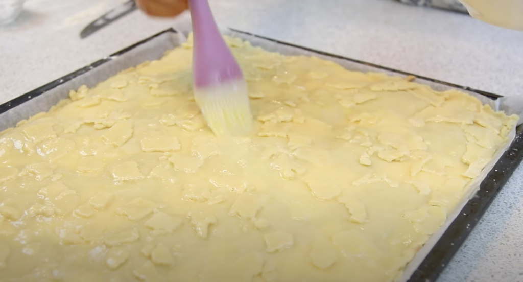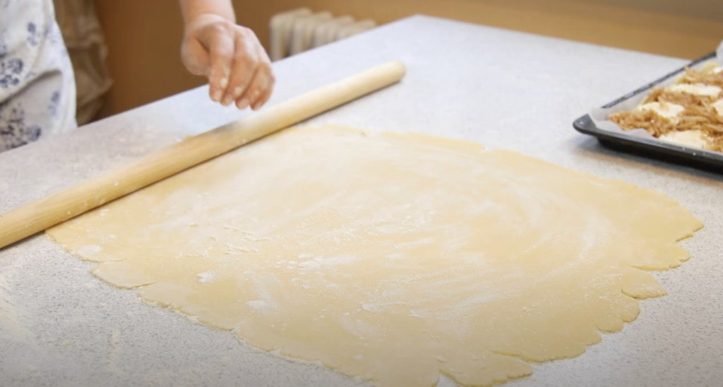 Wyjmij ciasto z lodówki, podziel je na 2 części. Pierwszą z nich cienko rozwałkuj. Blachę wyłóż papierem do pieczenia, a następnie rozłóż pierwszą część ciasta – tak, aby lekko zachodziło na ścianki.