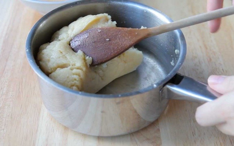 Wodę i masło umieszczamy w niewielkim garnku na wolnym ogniu i doprowadzamy do zagotowania. Następnie delikatnie przesypujemy przesianą mąkę i dokładnie mieszamy do uzyskania gładkiej struktury ciasta. Wbijamy po jednym jajku i za pomocą miksera łączymy składniki.