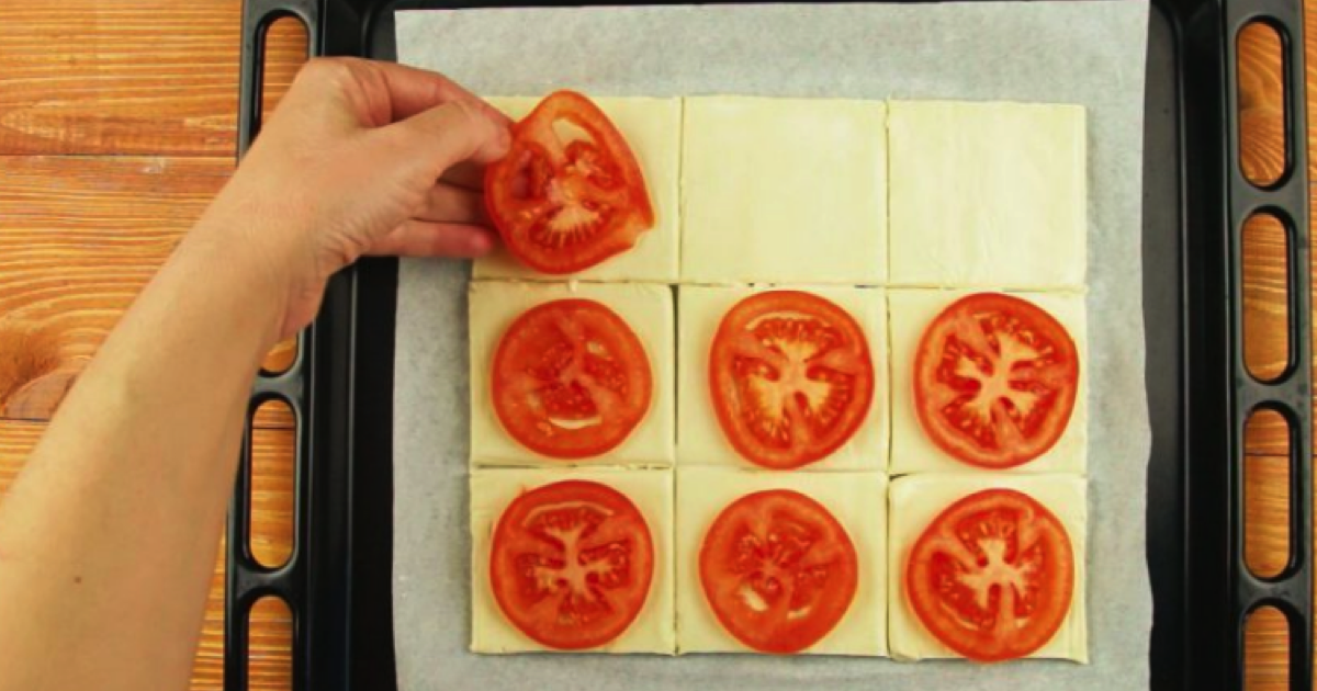 Przygotuj własnoręcznie ciasto francuskie lub użyj kupnego. Rozłóż je na płaskiej powierzchni i podziel na równe kwadraty – 3×3 lub 4×4 cm. Wierzch przesmaruj mlekiem. Pomidory sparz gorącą wodą, pokrój w średniej grubości plastry i ułóż po jednym na każdą część ciasta. Wstaw na kwadrans do piekarnika, piecz w temperaturze 180 stopni.