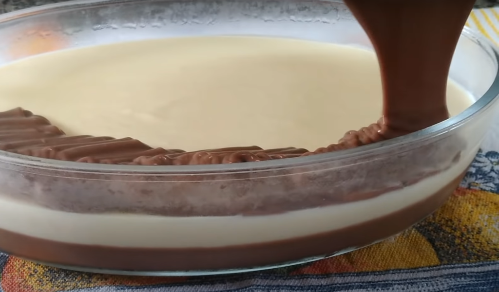 3. Teraz, wyłóż równomiernie do miski drugą część kremu – bez dodatków. Trzecią część kremu, energicznie wymieszaj trzepaczką z pokruszoną mleczną czekoladą, aż się rozpuści i wyłóż jako trzecią warstwę do miski.