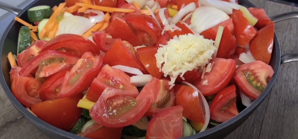 Pomidory pokrój na plastry. Wszystkie pokrojone warzywa wymieszaj z ziołami, cukrem, solą, olejem roślinnym i czosnkiem.
