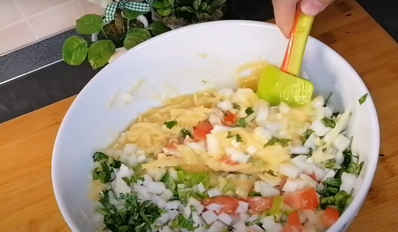 1. Obierz ziemniaki, następnie na tarce o grubych oczkach zetrzyj je, dokładnie wyciśnij sok. Paprykę, cebulę i pomidora dokładnie umyj, następnie pokrój na kawałeczki. Do drugiej miski wbij jajka, przypraw pieprzem, solą, dolej oliwy i mleka. Dodaj wszystkie warzywa i mocno wymieszaj.