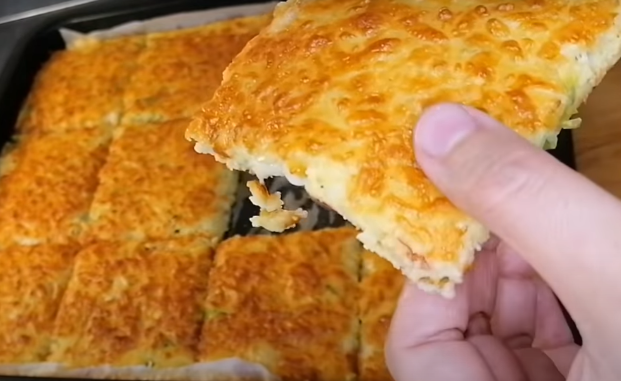 2. Pokrój w kostkę ser, wymieszaj z pozostałymi składnikami, dodawaj stopniowo mąkę i proszek do pieczenia, wszystko dokładnie wymieszaj. Na blachę wyłóż papier i rozprowadź masę ziemniaczaną.