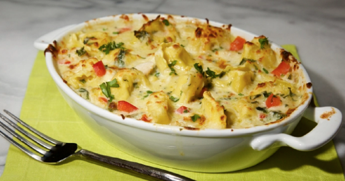 Przepis na zapiekankę z kurczakiem, pesto paprykowym i tortellini.