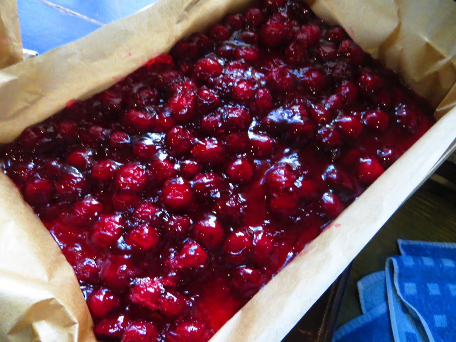 7. Do wystudzonej galaretki, dodaj wiśnie i wymieszaj. Gdy tylko zacznie gęstnieć – wyłóż ją na upieczone wcześniej ciasto.