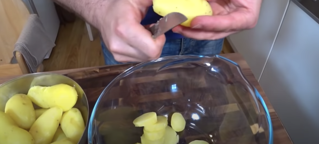 1. Ziemniaki ugotuj w mundurkach do miękkości w lekko osolonej wodzie. Potem je odcedź, wystudź, obierz i pokrój w średnie plasterki.